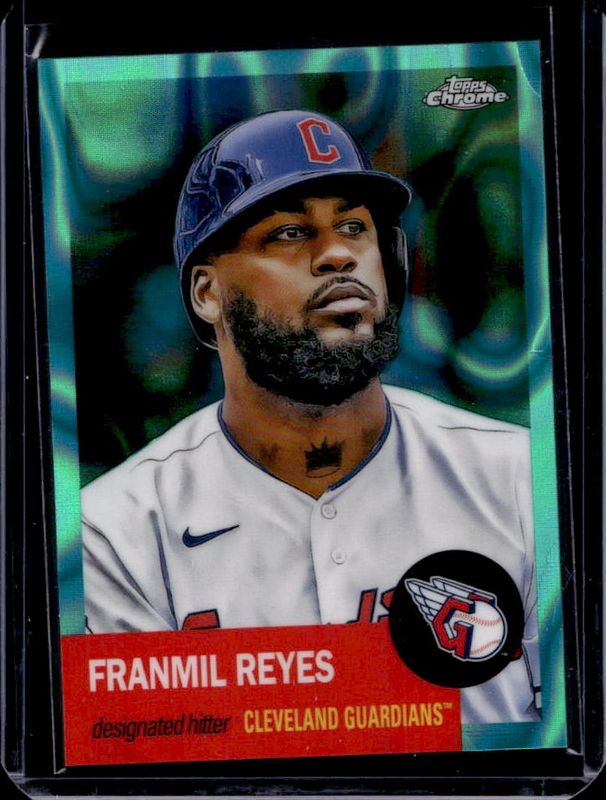 The Franmil Reyes 2022 Topps Chrome Platinum Anniversary #221 Aqua Lava Refractor /299 card is 1 of 45 Franmil Reyes' card variations in the 2022 Topps Chrome Platinum Anniversary set being tracked by Sports Card Investor, including Base, Black & White Mini Diamond Refractor, Blue Prism Refractor, Gold Prism Refractor, and Prism Refractor.