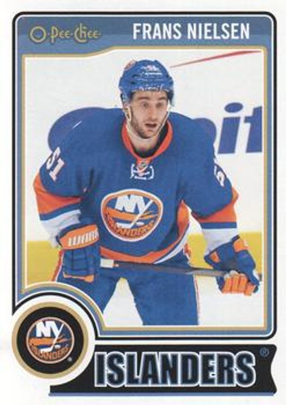 The Frans Nielsen 2014 O-Pee-Chee #136 Base card is 1 of 6 Frans Nielsen's card variations in the 2014 O-Pee-Chee set being tracked by Sports Card Investor, including Rainbow, Red, Retro, Retro Blank Backs, and Black Rainbow /100.