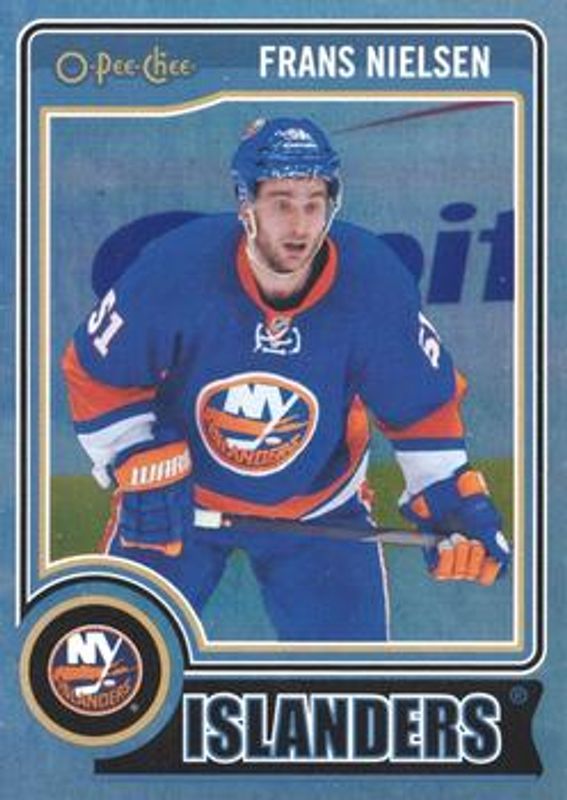 The Frans Nielsen 2014 O-Pee-Chee #136 Rainbow card is 1 of 6 Frans Nielsen's card variations in the 2014 O-Pee-Chee set being tracked by Sports Card Investor, including Base, Red, Retro, Retro Blank Backs, and Black Rainbow /100.