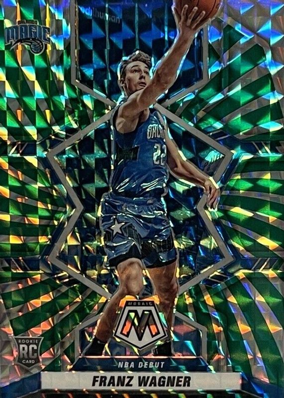 The Franz Wagner 2021 Mosaic #267 NBA Debut - Green Swirl /10 Rookie card in Raw condition has not changed in price in the last 30 days and was last sold for $165.00 .