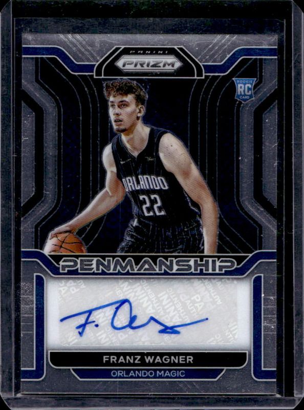 The Franz Wagner 2021 Prizm #RP-FRW Rookie Penmanship card is 1 of 102 Franz Wagner's card variations in the 2021 Prizm set being tracked by Sports Card Investor, including #310b Base, #310 Base, #310 Photo Variation, #310 Blue NBA 75th Anniversary, and #310 Blue Wave.