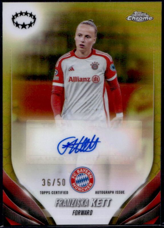 The Franziska Kett 2023 Topps Chrome UEFA Women's Champions League #A-FZ Autographs - Gold /50 card is 1 of 30 Franziska Kett's card variations in the 2023 Topps Chrome UEFA Women's Champions League set being tracked by Sports Card Investor, including Base, Aqua Prism, Pulsar, Refractor, and XI.