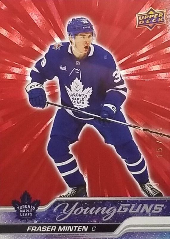 The Fraser Minten 2023 Upper Deck #482 Young Guns - Outburst Red /25 Rookie card in Raw condition has not changed in price in the last 30 days and was last sold for $122.72 .