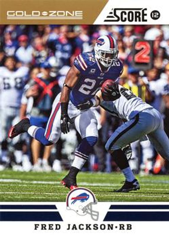 The Fred Jackson 2012 Score #266 Gold Zone card is 1 of 14 Fred Jackson's card variations in the 2012 Score set being tracked by Sports Card Investor, including Glossy, Scorecard, Artist's Proof /32, Red Zone /20, and End Zone /6.