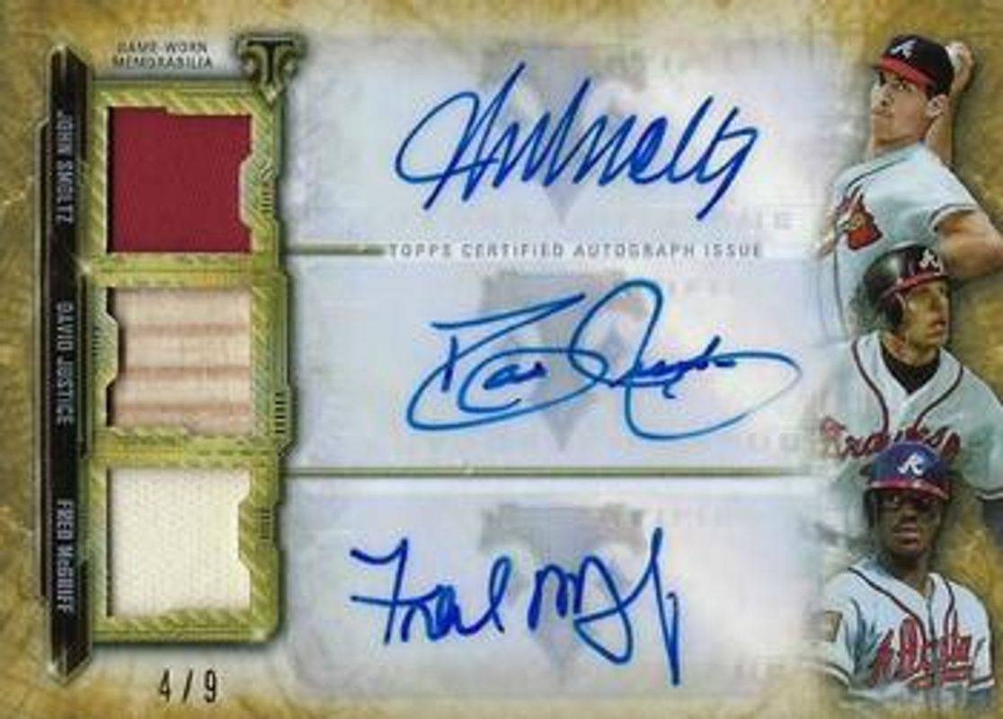 The Fred McGriff 2020 Topps Triple Threads #ARC-SJM Autographs Relic Combo - Gold /9 card is 1 of 25 Fred McGriff's card variations in the 2020 Topps Triple Threads set being tracked by Sports Card Investor, including #ARC-SJM Autographs Relic Combo /36, #ARC-SJM Autographs Relic Combo - Amethyst /27, #ARC-SJM Autographs Relic Combo - Emerald /18, #TTAR-FM1 Autographs Relics /18, and #TTAR-FM2 Autographs Relics /18.
