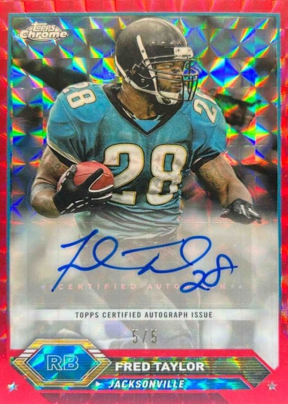 Fred Taylor's Football cards are available in at least 170 sets. Fred Taylor's biggest 7-day price movers are 2023 Topps Composite #TCA-FT Chrome Autographs - Geometric Red /5, 2024 Topps Midnight #46 Base, and 2024 Topps Midnight #46 Daybreak /5.