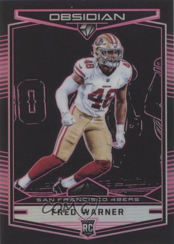 This card is 1 of 7 Fred Warner's card variations in the 2018 Obsidian set being tracked by Sports Card Investor, including Base /100, Electric Etch Orange /50, Electric Etch Green /25, Electric Etch Yellow /10, and Electric Etch Red /5.