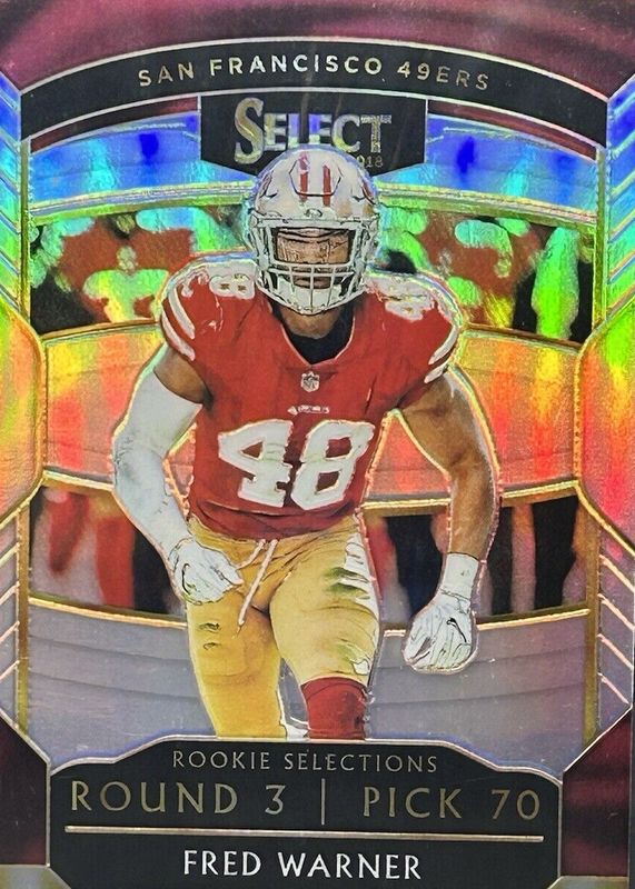 This card is 1 of 31 Fred Warner's card variations in the 2018 Select set being tracked by Sports Card Investor, including Concourse, Concourse Silver, Concourse Tri-Color /199, Concourse Blue /175, and Concourse Maroon /99.