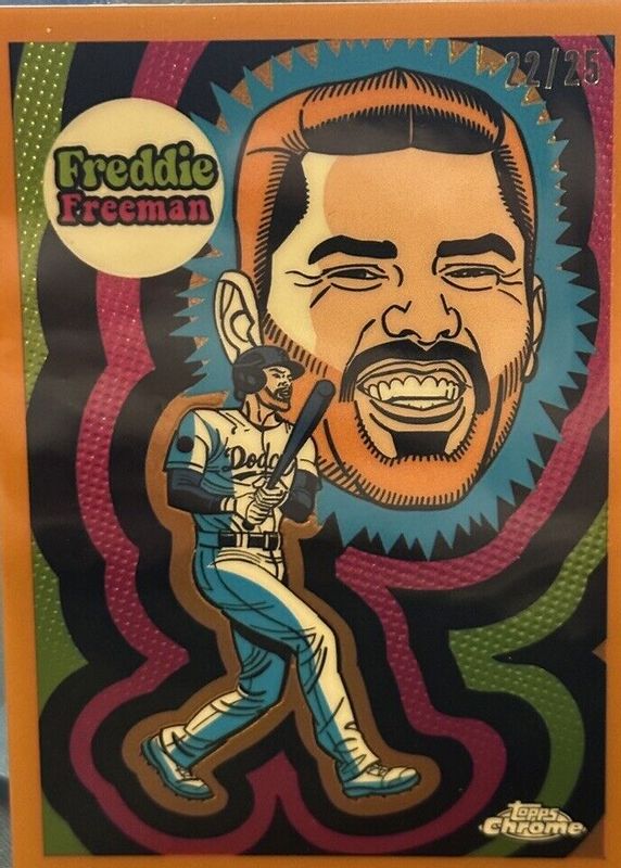 The Freddie Freeman 2023 Topps Chrome #UV-6 Ultraviolet All-Stars - Orange Refractor /25 card in Raw condition has not changed in price in the last 30 days and was last sold for $69.99 .