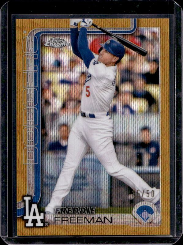 The Freddie Freeman 2025 Topps Chrome #23 Gold Wave Refractor /50 card is 1 of 88 Freddie Freeman's card variations in the 2025 Topps Chrome set being tracked by Sports Card Investor, including Base, Geometric Refractor, Image Variation, Lightboard Logo Variation, and Negative Refractor.