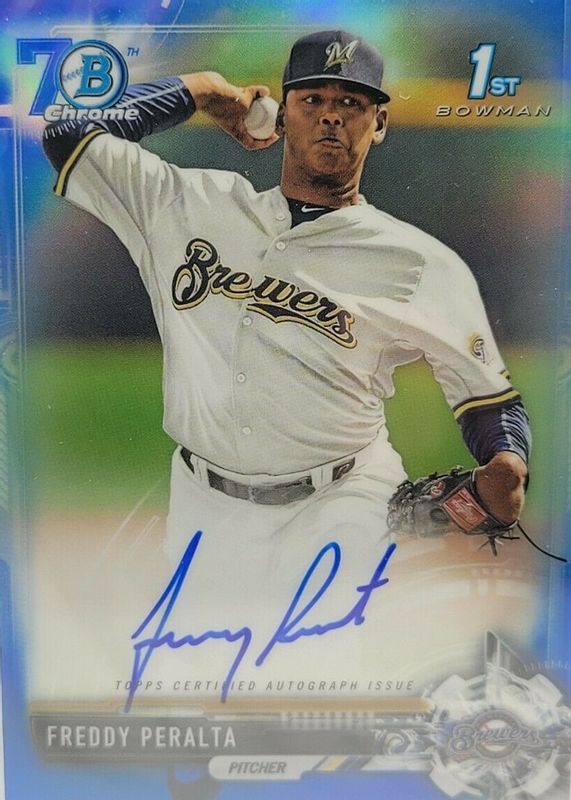 Best Prices Available For Sale of Freddy Peralta 2017 Bowman #CPA-FP Chrome Prospect Auto - 70th Anniversary Blue Refractor (1st)