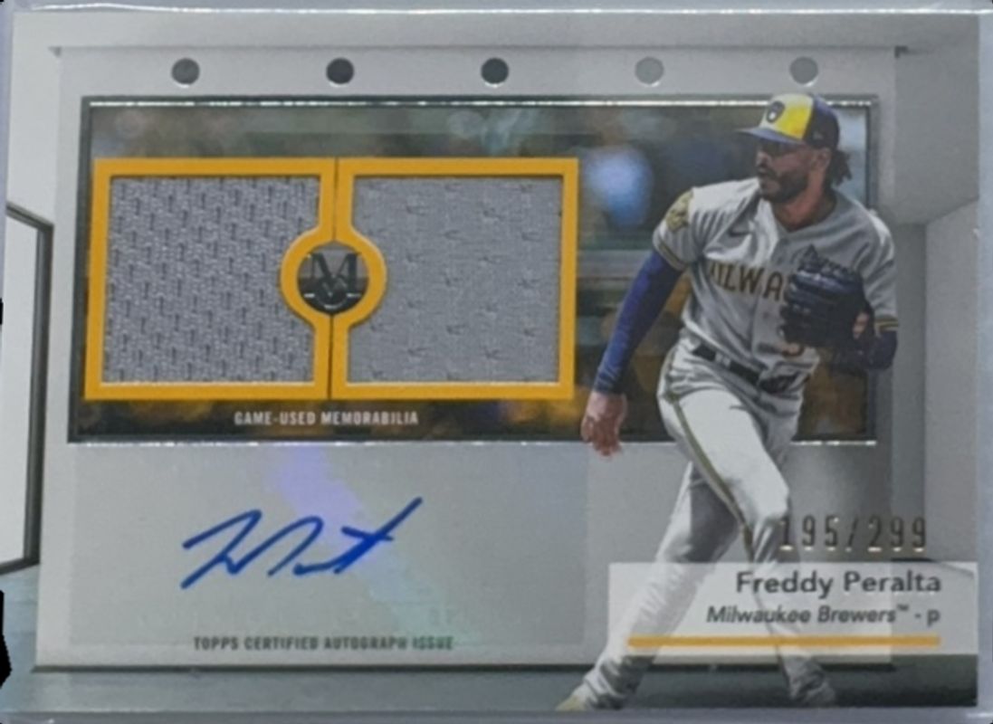 The Freddy Peralta 2024 Topps Museum Collection #SWDRA-FP Single Player Signatures Swatches Dual Relic Autographs /299 card is 1 of 10 Freddy Peralta's card variations in the 2024 Topps Museum Collection set being tracked by Sports Card Investor, including Single Player Signatures Swatches Dual Relic Autographs - Pink /99, Single Player Signatures Swatches Dual Relic Autographs - Copper /50, Single Player Signatures Swatches Dual Relic Autographs - Gold /25, Single Player Signatures Swatches Dual Relic Autographs - Sapphire /20, and Single Player Signatures Swatches Dual Relic Autographs - Amethyst /15.