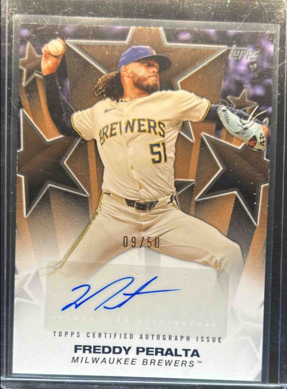The Freddy Peralta 2025 Topps #BSA2-FP Baseball Stars Autographs (Series 2) - Gold /50 card is 1 of 80 Freddy Peralta's card variations in the 2025 Topps set being tracked by Sports Card Investor, including Base, Aqua Holo Foil, Diamante Foil, Holo Foil, and Pink Diamante Foil.