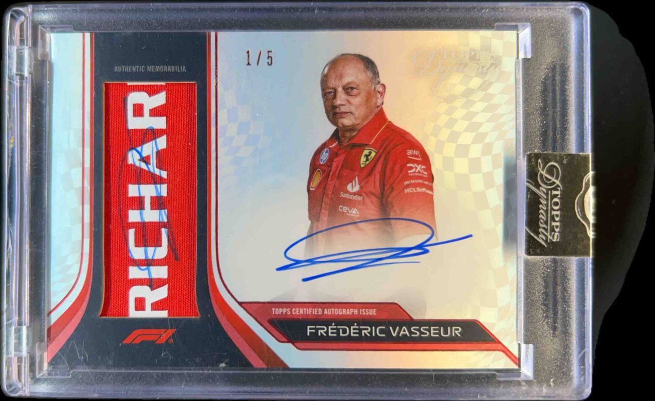 The Frederic Vasseur 2024 Topps Dynasty Formula 1 #DAP-FVA Autographed Patch - Red /5 card is 1 of 24 Frederic Vasseur's card variations in the 2024 Topps Dynasty Formula 1 set being tracked by Sports Card Investor, including #DAP-FVA Autographed Patch /10, #DAP-FVAIII Autographed Patch /10, #DAP-FVAII Autographed Patch /10, #SDTRA-FVAII Single Driver Triple Relic Autographs /10, and #SDTRA-FVAIII Single Driver Triple Relic Autographs /10.