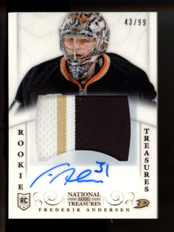 The Frederik Andersen 2013 National Treasures #157 Base /99 Rookie card is 1 of 9 Frederik Andersen's card variations in the 2013 National Treasures set being tracked by Sports Card Investor, including Rainbow /21, Rookie Timeline Jerseys /99, Rookie Timeline Jerseys Prime /50, Rookie Timeline Jerseys Patch /25, and Rookie Treasures Brand Logo /5.