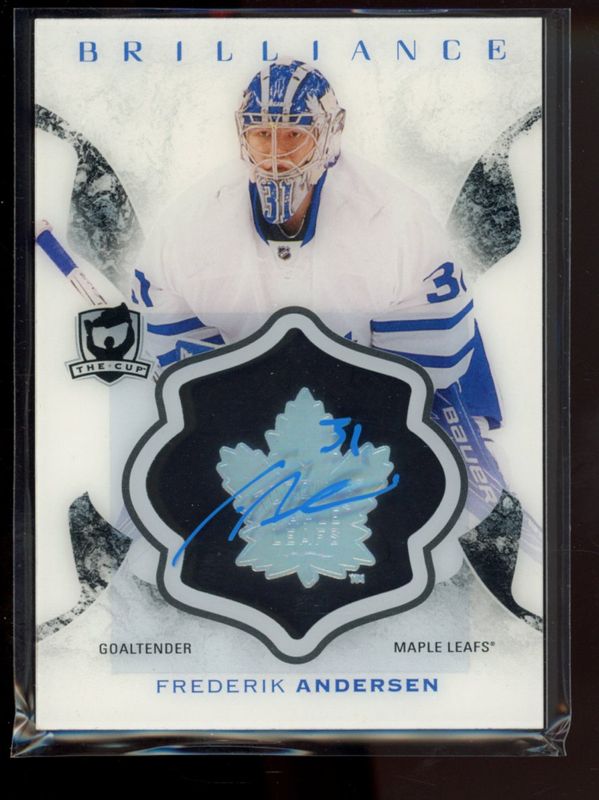 The Frederik Andersen 2016 Upper Deck The Cup #B-FA Brilliance Autographs card is 1 of 13 Frederik Andersen's card variations in the 2016 Upper Deck The Cup set being tracked by Sports Card Investor, including Base /249, Gold Patch /24, Gold Spectrum /12, Red Tag /8, and Green Button /3.