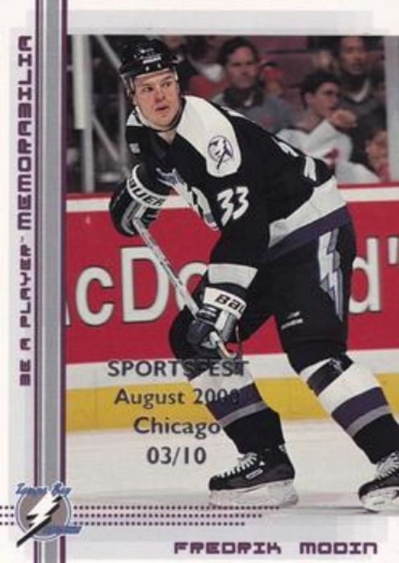 The Fredrik Modin 2000 In The Game Be a Player Memorabilia #191 Chicago Sportsfest Purple /10 card is 1 of 23 Fredrik Modin's card variations in the 2000 In The Game Be a Player Memorabilia set being tracked by Sports Card Investor, including Base, Promos, Ruby /200, Sapphire /100, and Chicago Sportsfest Blue /10.