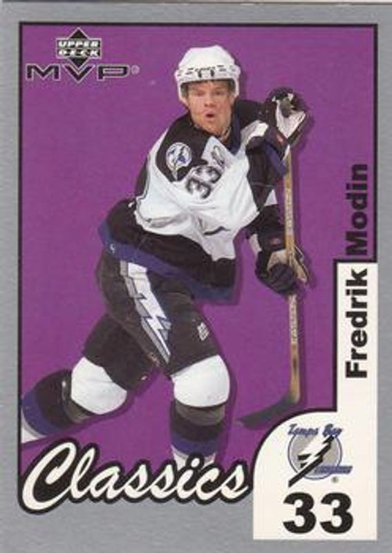 The Fredrik Modin 2002 Upper Deck MVP #168 Classics card is 1 of 4 Fredrik Modin's card variations in the 2002 Upper Deck MVP set being tracked by Sports Card Investor, including Base, Gold /100, and Golden Classics /50.