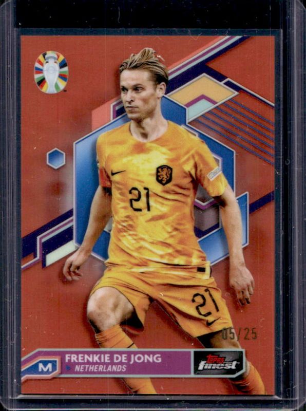 The Frenkie de Jong 2023 Topps Finest Road to UEFA Euro #51 Orange Refractor /25 card is 1 of 21 Frenkie de Jong's card variations in the 2023 Topps Finest Road to UEFA Euro set being tracked by Sports Card Investor, including Base, Refractor, Blue Aqua Vaporwave Refractor /250, Blue Refractor /150, and Green Speckle Refractor /125.