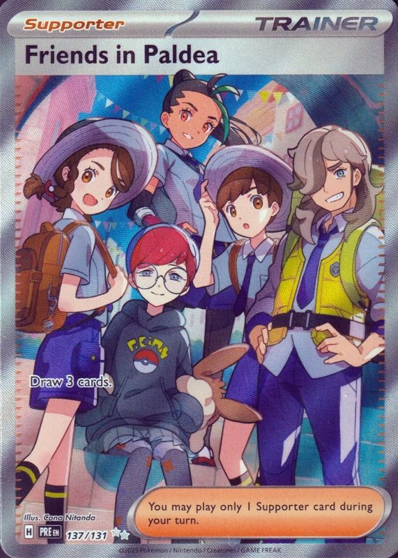 The Friends in Paldea 2025 Scarlet & Violet: Prismatic Evolutions #137/131 Ultra Rare (Full Art) card in Raw TCG (Near Mint) condition has moved down -$0.46 (-15.6%) in the last 30 days and was last sold for $2.49 .