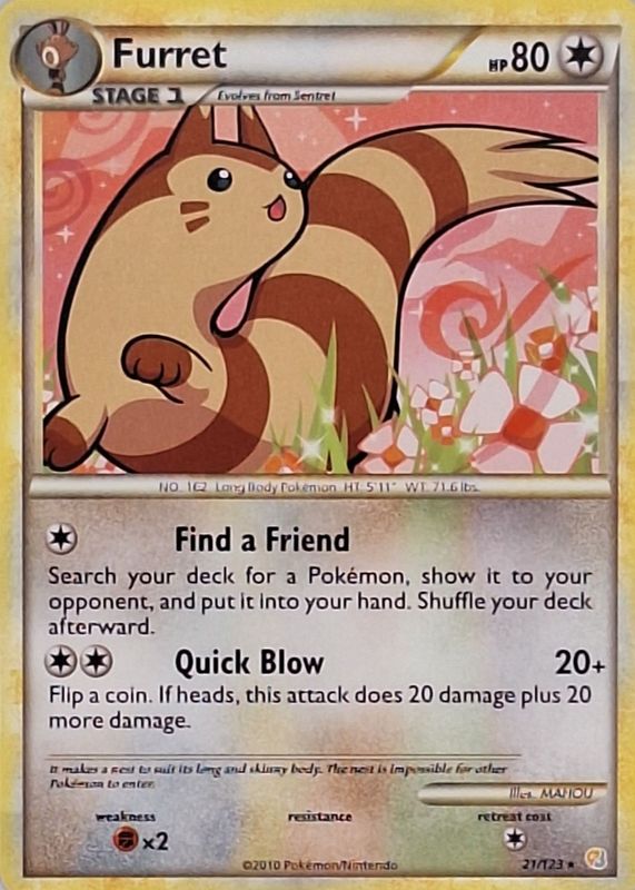 The Furret 2010 HeartGold & SoulSilver #021/123 Base card in Raw TCG (Lightly Played) condition has moved down -$3.85 (-55.1%) in the last 30 days and was last sold for $3.14 .