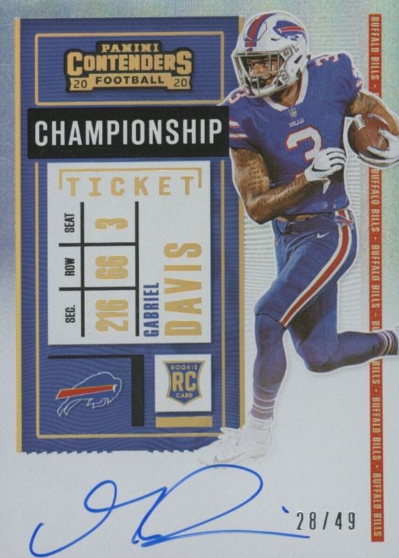 The Gabriel Davis 2020 Contenders #139 Rookie Ticket Auto - Championship Ticket /49 card in Raw condition has not changed in price in the last 30 days and was last sold for $8.30 .
