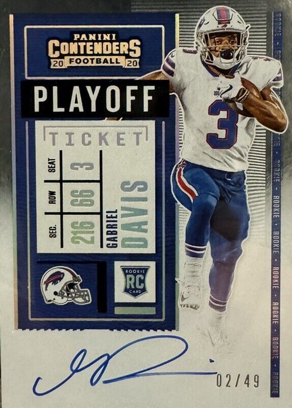 The Gabriel Davis 2020 Contenders #139 Rookie Ticket Auto Variation - Playoff Ticket /49 card in Raw condition has not changed in price in the last 30 days and was last sold for $19.99 .