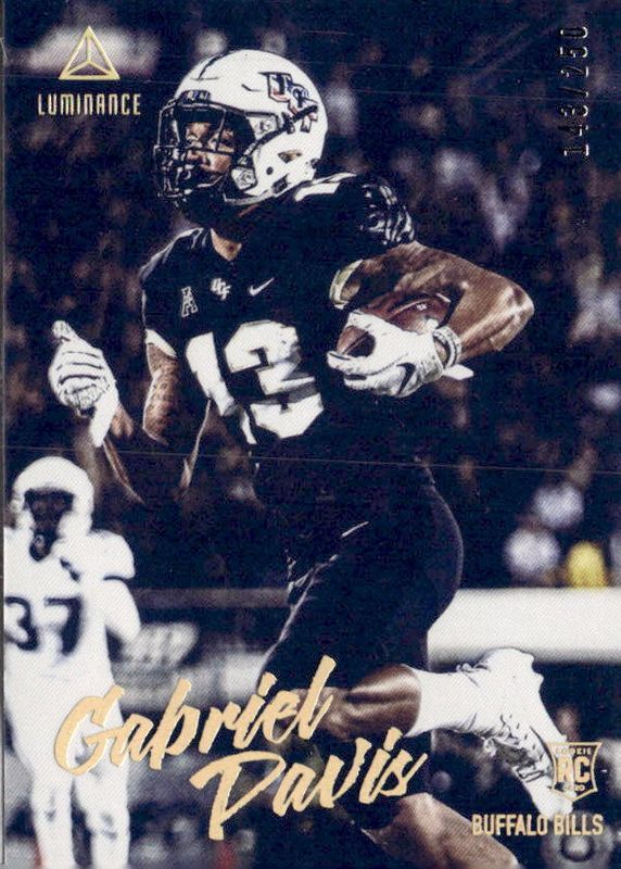 This card is 1 of 8 Gabriel Davis' card variations in the 2020 Luminance set being tracked by Sports Card Investor, including Gold (Rookie) /250, Blue /99, Green /75, Orange /50, and Red /25.
