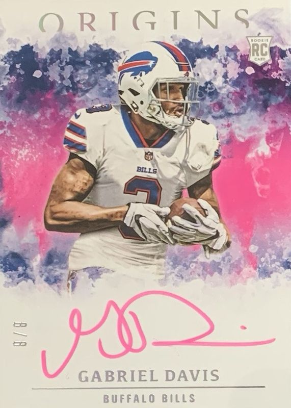 This card is 1 of 9 Gabriel Davis' card variations in the 2020 Origins set being tracked by Sports Card Investor, including Rookie Autographs, Rookie Autographs - Red /99, Rookie Autographs - Blue /49, Rookie Autographs - Turquoise /25, and Rookie Autographs - Purple FOTL /17.