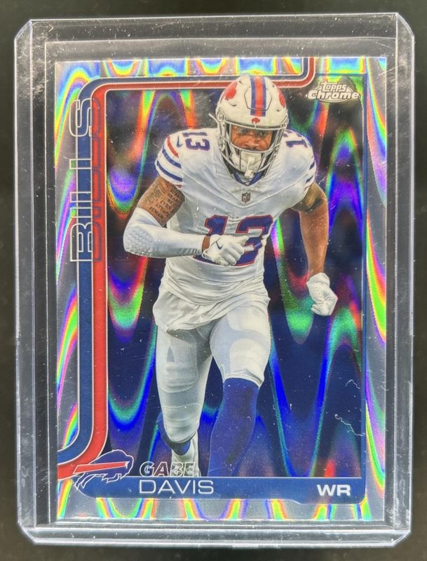 The Gabriel Davis 2025 Topps Chrome #142 RayWave Refractor card is 1 of 57 Gabriel Davis' card variations in the 2025 Topps Chrome set being tracked by Sports Card Investor, including Base, Football Leather Refractor, Geometric Refractor, Hot Pink X-Fractor, and Lime Green X-Fractor.