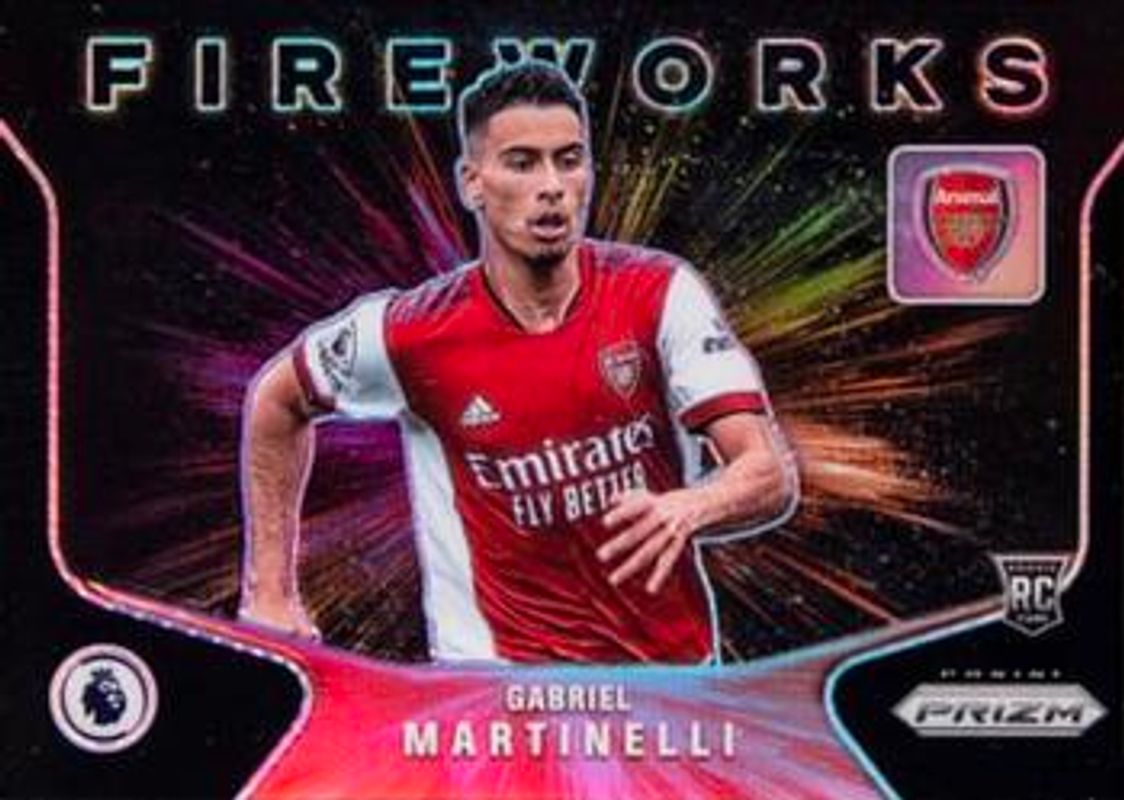 The Gabriel Martinelli 2021 Prizm Premier League #14 Fireworks - Black /1 Rookie card is 1 of 76 Gabriel Martinelli's card variations in the 2021 Prizm Premier League set being tracked by Sports Card Investor, including Base, Blue Mojo, Blue Wave, Breakaway, and Choice Blue Yellow Green.