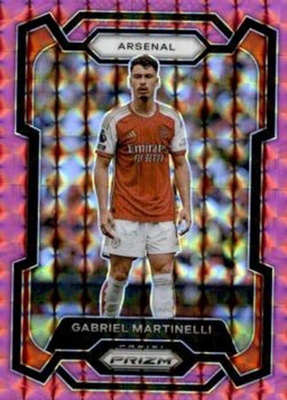 The Gabriel Martinelli 2023 Prizm Premier League #25 Pink Mosaic card is 1 of 63 Gabriel Martinelli's card variations in the 2023 Prizm Premier League set being tracked by Sports Card Investor, including Base, Blue Mosaic, Breakaway, Breakaway Orange, and Choice.