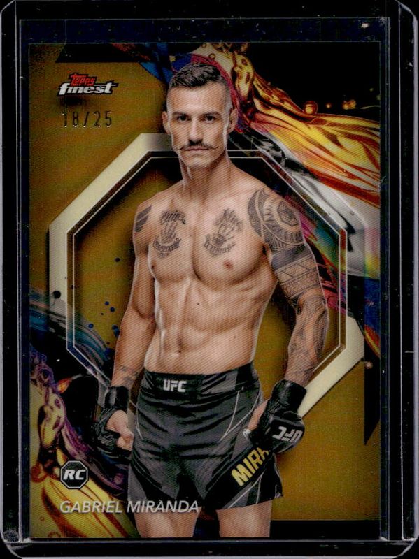 The Gabriel Miranda 2024 Topps Finest UFC #175 Gold Refractor Rookie card is 1 of 47 Gabriel Miranda's card variations in the 2024 Topps Finest UFC set being tracked by Sports Card Investor, including #175 Base, #67 Base, #175 Aqua Glitter Refractor, #67 Aqua Glitter Refractor, and #175 Black Refractor.