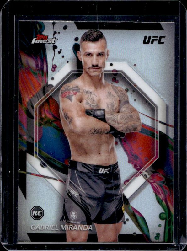 The Gabriel Miranda 2024 Topps Finest UFC #67 Refractor Rookie card is 1 of 47 Gabriel Miranda's card variations in the 2024 Topps Finest UFC set being tracked by Sports Card Investor, including #175 Base, #67 Base, #175 Aqua Glitter Refractor, #67 Aqua Glitter Refractor, and #175 Black Refractor.
