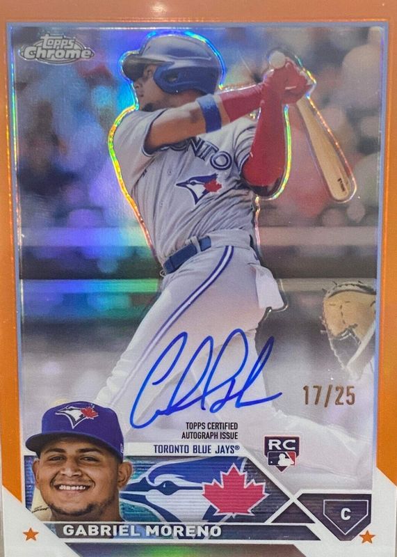 Gabriel Moreno's Baseball cards are available in at least 58 sets. Gabriel Moreno's biggest 7-day price movers are 2023 Topps Chrome #RA-GMO Rookie Autographs - Orange Refractor /25, 2020 Bowman Chrome #CPA-GM Prospect Auto - Green Atomic Refractor /99 (1st), and 2023 Topps Chrome #189 Gold Wave Refractor /50.