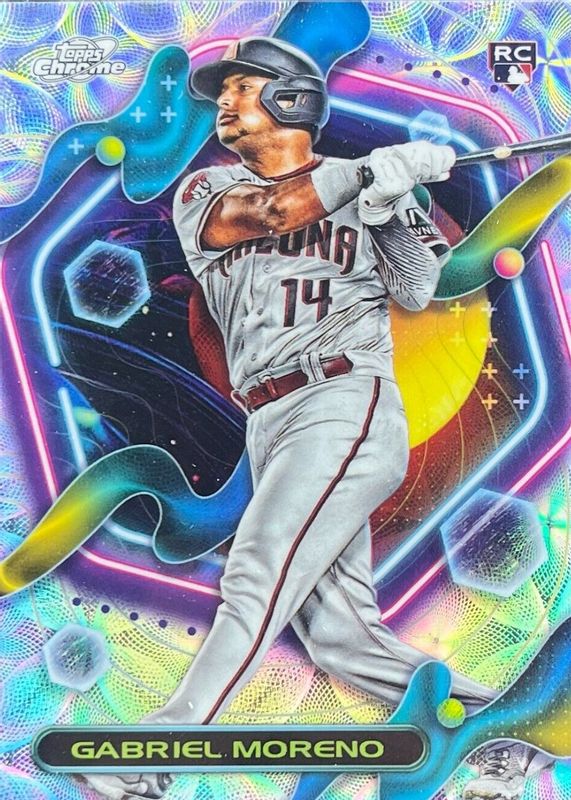 Gabriel Moreno's Baseball cards are available in at least 49 sets. Gabriel Moreno's biggest 7-day price movers are 2023 Topps Chrome #RA-GMO Rookie Autographs - Refractor /499, 2020 Bowman Chrome #CPA-GM Prospect Auto (1st), and 2023 Topps Chrome Cosmic #14 Nucleus Refractor.