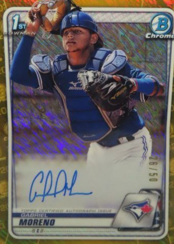 The Gabriel Moreno 2020 Bowman Chrome #CPA-GM Prospect Auto - Gold Shimmer Refractor /50 (1st) card in Raw condition has not changed in price in the last 30 days and was last sold for $51.00 .