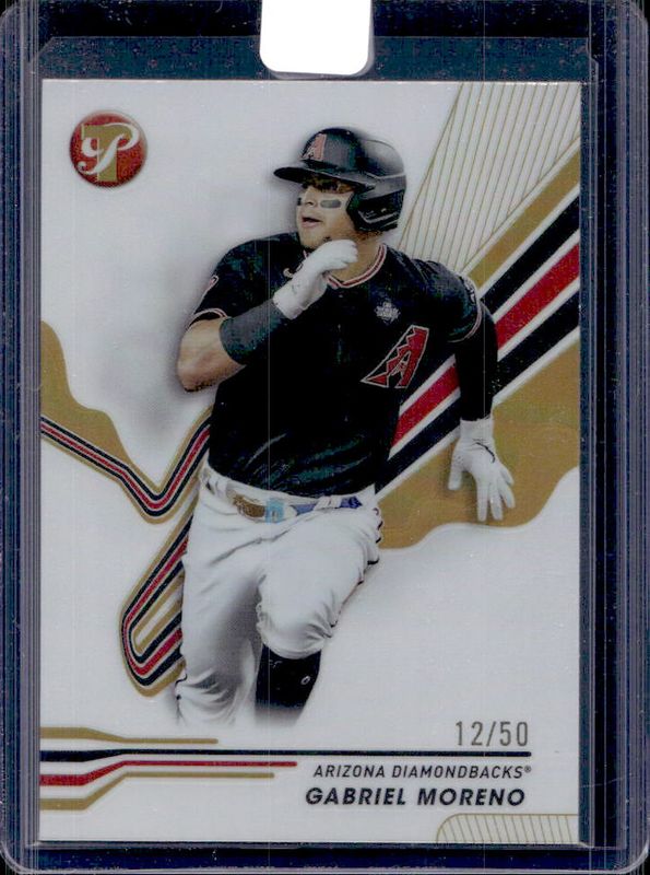 The Gabriel Moreno 2024 Topps Pristine #28 Gold Refractor /50 card is 1 of 18 Gabriel Moreno's card variations in the 2024 Topps Pristine set being tracked by Sports Card Investor, including Base, Pristine Refractor, Refractor, Green Refractor /150, and Pristine Purple Refractor /99.