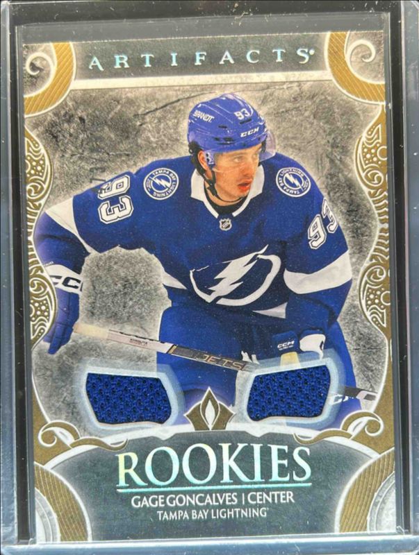 The Gage Goncalves 2024 Upper Deck Artifacts #195 Material - Gold /199 Rookie card is 1 of 27 Gage Goncalves' card variations in the 2024 Upper Deck Artifacts set being tracked by Sports Card Investor, including Clear Cut, Foilboard, Foilboard Gold, Neon Green, and Plexi.