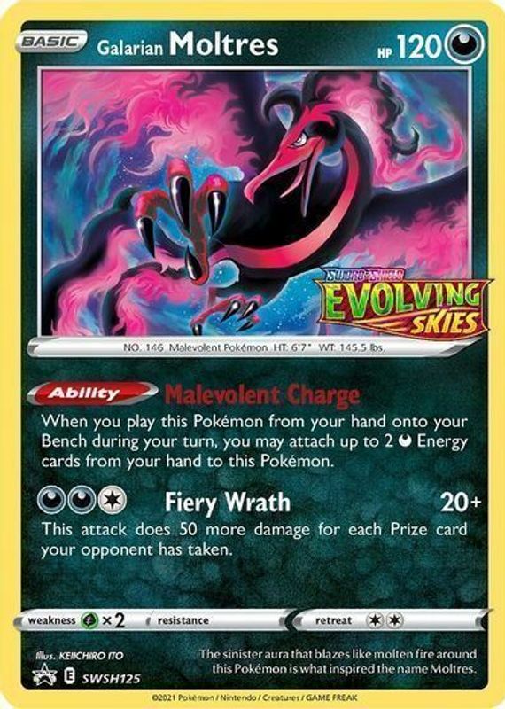 The Galarian Moltres 2021 Sword & Shield: Black Star Promo #SWSH125 Build & Battle Box (Evolving Skies) card in Raw TCG (Near Mint) condition has moved down -$0.25 (-2.4%) in the last 30 days and was last sold for $10.36 .