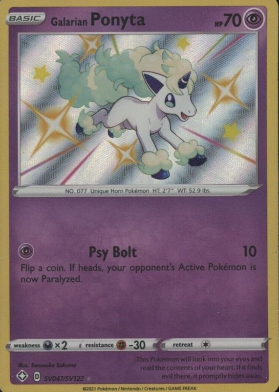 The Galarian Ponyta 2021 Sword & Shield: Shining Fates #SV047 Shiny Rare card in Raw TCG (Near Mint) condition has moved down -$2.65 (-24.3%) in the last 30 days and was last sold for $8.25 .