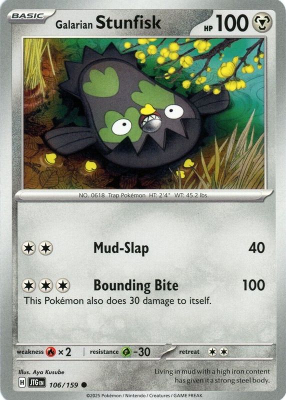 The Galarian Stunfisk 2025 Scarlet & Violet: Journey Together #106/159 Base card in Raw TCG (Near Mint) condition has not changed in price in the last 30 days and was last sold for $0.99 .