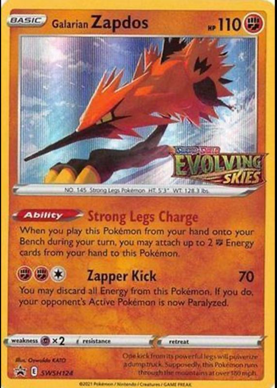 The Galarian Zapdos 2021 Sword & Shield: Black Star Promo #SWSH124 Build & Battle Box (Evolving Skies) card in Raw TCG (Near Mint) condition has moved down -$1.48 (-15.9%) in the last 30 days and was last sold for $7.83 .