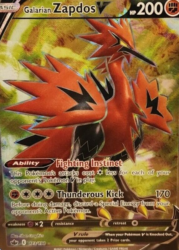The Galarian Zapdos V 2021 Sword & Shield: Chilling Reign #173/198 Holo (Full Art) card in Raw TCG (Near Mint) condition has moved up $5.18 (+72.9%) in the last 30 days and was last sold for $12.29 .