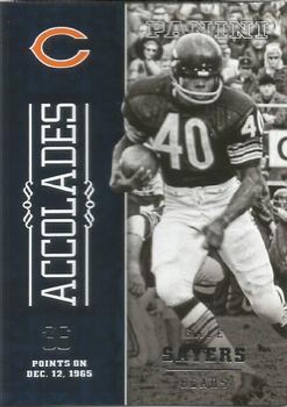 The Gale Sayers 2016 Panini #3 Accolades card is 1 of 4 Gale Sayers' card variations in the 2016 Panini set being tracked by Sports Card Investor, including Accolades - Red /25, Accolades - Gold /10, and Accolades - Black /1.