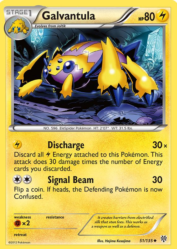 The Galvantula 2013 Black & White: Plasma Storm #051/135 Base card in Raw TCG (Lightly Played) condition has not changed in price in the last 30 days and was last sold for $2.50 .