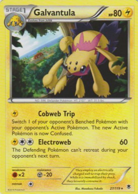 The Galvantula 2014 XY: Phantom Forces #027/119 Base card in Raw TCG (Near Mint) condition has not changed in price in the last 30 days and was last sold for $2.00 .