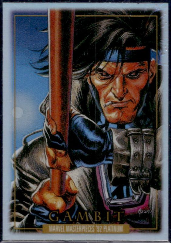 The Gambit 2024 Upper Deck Marvel Masterpieces '92 Platinum #29 Rainbow card is 1 of 38 Gambit's card variations in the 2024 Upper Deck Marvel Masterpieces '92 Platinum set being tracked by Sports Card Investor, including Base, Blue Traxx, Canvas, Clear Cut, and Emerald Surge.