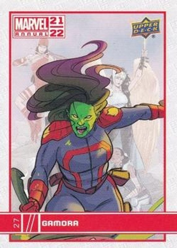 The Gamora 2021 Upper Deck Marvel Annual #27 Base card is 1 of 15 Gamora's card variations in the 2021 Upper Deck Marvel Annual set being tracked by Sports Card Investor, including Blue, Canvas Variant, Green, Magenta, and Red.