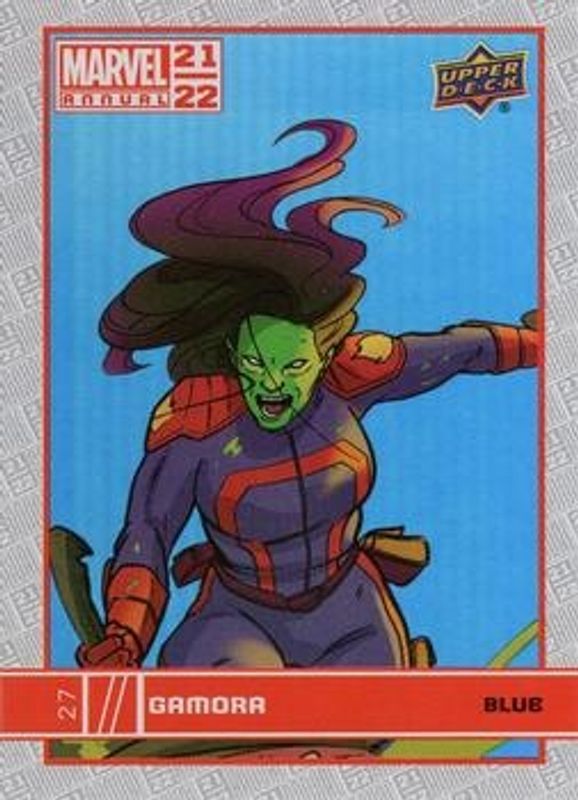 The Gamora 2021 Upper Deck Marvel Annual #27 Blue card is 1 of 15 Gamora's card variations in the 2021 Upper Deck Marvel Annual set being tracked by Sports Card Investor, including Base, Canvas Variant, Green, Magenta, and Red.